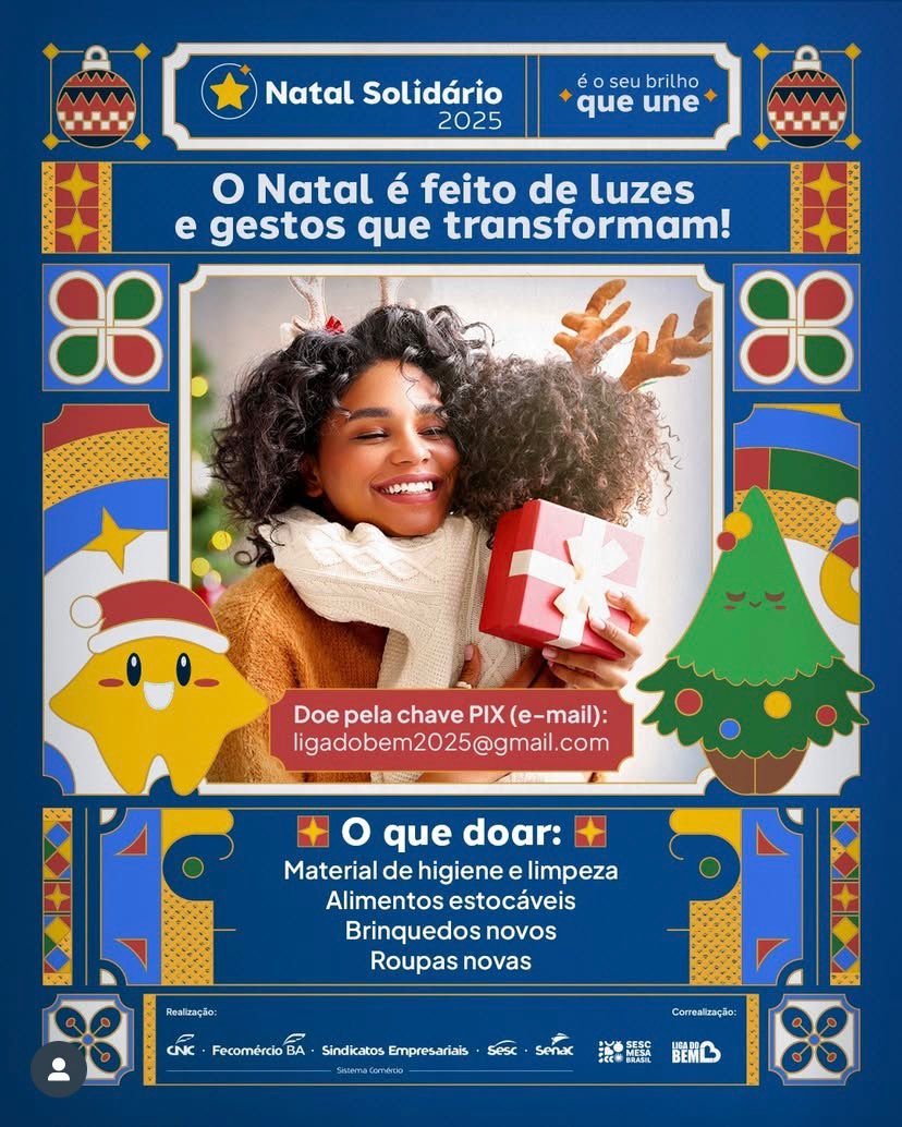 A campanha Natal Solidário envolve toda a sociedade em uma grande rede de solidariedade. As doações podem ser feitas em produtos ou em dinheiro, por meio de chave PIX, em nome do Instituto Liga do Bem. Um dos fundadores desta entidade é Loyola Neto, o mesmo que está no centro das denúncias anteriores. Ele, atualmente, é Conselheiro Fiscal da Liga do Bem. No site e nas redes sociais da Fecomércio, tanto o QRcode, quanto a chave pix: ligadobem2025@gmail.com disponibilizados pertencem ao Instituto.